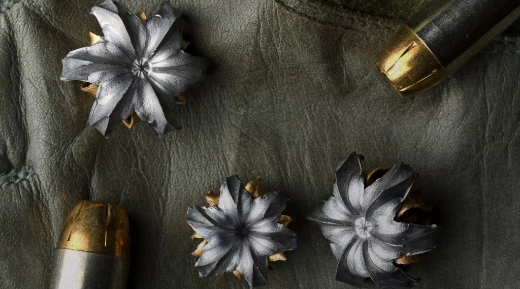 It’s called mushrooming. This happens when the hollow cavity and jacketed design force the bullet’s tip to peel outward and flatten, forming a mushroom-like bell. “Amazing, right?”. That wider profile increases frontal area, dumps more energy into the target, and reduces the chance of overpenetration, which is why reliable mushrooming is a key goal for defensive hollow-point designs.