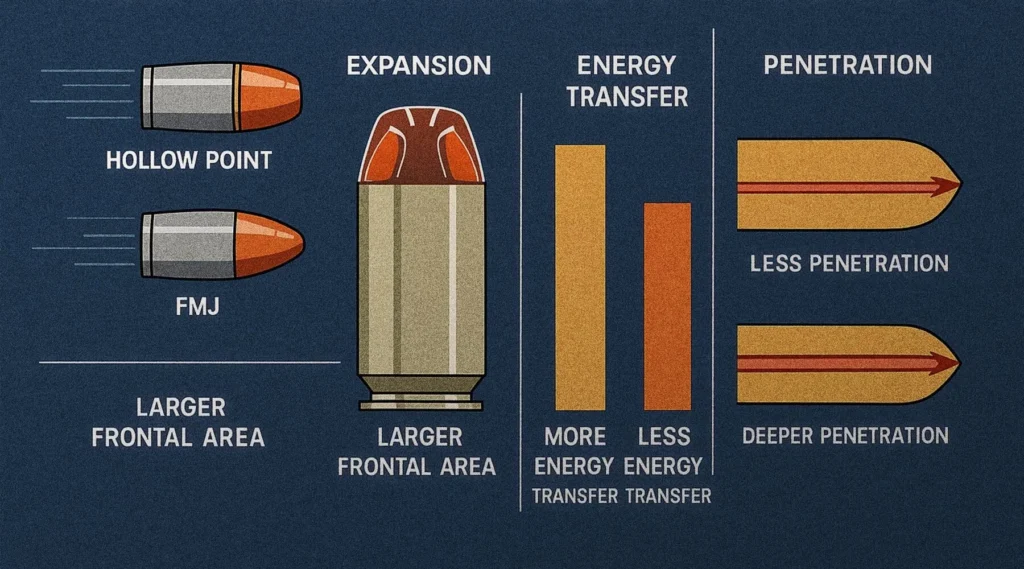 Hollow points cause more immediate tissue disruption and typically create larger wound channels than FMJ at the same energy level. In plain terms, a properly functioning hollow point is more likely to incapacitate faster than an FMJ because it dumps more energy and creates greater internal damage. FMJ may travel farther through the body and can produce less immediate stopping trauma.