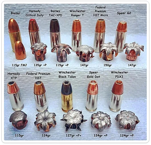 Bullet weight matters. Common 9mm hollow point grains are 115, 124, and 147 each behaves differently: