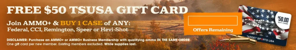Join Ammo+ today, grab your case of Federal, CCI, Remington, Speer, or Hevi-Shot ammo, and claim your $50 TSUSA gift card before they’re gone.