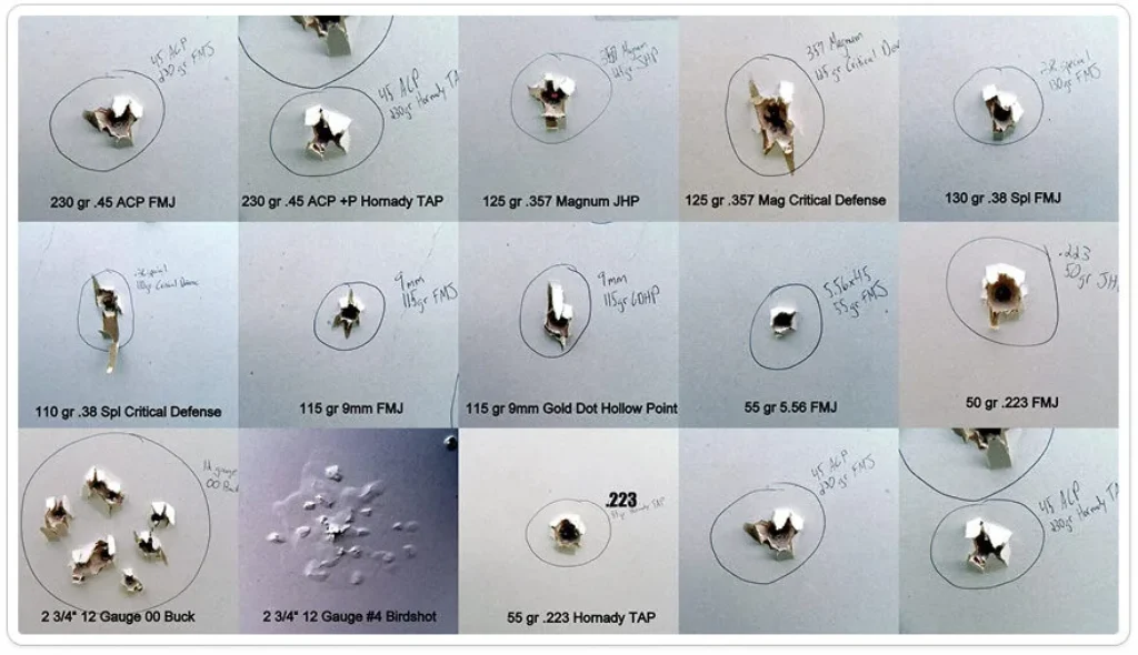 Look for independent ballistic gel and drywall test photos or videos. Good tests will show a clear comparison of wound channel, retained mass, and how many barrier layers the bullet passed through. If a load consistently fragments or stops within a short distance, it is a smart candidate for home defense purchases.